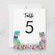 Esta divertida novia y novio de T-Rex en un boda prehistórico de flores silvestres con temática de dinosaurio encantará a sus huéspedes y les traerá el dino divertido a su boda. Facilite a sus huéspedes bodas la posibilidad de encontrar su lugar al estilo boda Jurassic dinosaur. Simplemente agregue el número de tabla para cada tabla utilizando las plantillas simples para crear un gráfico de números de tabla de doble cara. Colorido Tyrannosaurus rex y pradera de flores silvestres color de agua en tonos verde azul violeta rosa naranja borgoña y verde azulado. Pintura original de la artista Catherine Sweetman