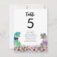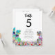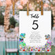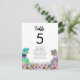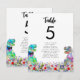 Esta divertida novia y novio T-Rex en un prado de flores silvestres prehistóricas coloridas carta de asientos para la mesa de la boda con tema de dinosaurios deleitará a sus invitados y traerá diversión de dinosaurios a su boda. Haga que sea fácil para sus invitados encontrar su lugar en estilo de boda de dinosaurios del Jurásico. Simplemente agregue el número de mesa y los nombres de los invitados para cada mesa utilizando las plantillas simples para crear una carta de número de mesa a doble cara que puede sujetar a una línea o tener en un soporte de mesa. Colorido Tyrannosaurus rex y prado de flores silvestres acuarela en tonos verde azul púrpura rosa amarillo naranja borgoña y turquesa. Obra original del artista Catherine Sweetman.