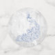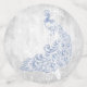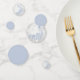 Las mesas están decoradas en el boda o en la ducha de novia, con la mesa de ducha de la ducha de tela azul claro de hoja de pavo real. El diseño de Confetti presenta un fondo gris claro con un pavo real azul claro y vibrante con un embellecimiento de una vid de hojas. También hay material de boda adicional disponible con este diseño.