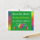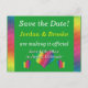 Un diseño sencillo pero elegante que pone la información importante en el centro y frente de una manera fácil de leer. El fondo sólido bordeado por una salpicadura de color arcoiris hace que esta postal sea difícil de ver en el buzón. Elige cualquier color que quieras para el fondo (se muestra aquí con verde en la parte delantera y blanco en la parte posterior). La parte posterior tiene un formato previo tanto para la dirección de devolución como para la de destinatario. Si prefiere dirigirse a mano a su Guardar las fechas, simplemente deje en blanco los campos de dirección del destinatario. Utilice los campos de plantilla proporcionados para personalizar rápidamente su información. Haga clic en "personalizar más adelante" para cambiar el tipo de letra, el tamaño, los colores y las posiciones.