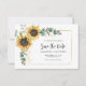 Una flor girasol moderna salva el anuncio de la fecha con esta bonita plantilla con un bonito ramo rústico floral, con una tipografía simple y moderna sobre fondo blanco. CONSEJO: En la colección que aparece a continuación se pueden encontrar tarjetas de suite boda como RSVP, programas de boda, carteles, tapiz, etiquetas de regalo, carteles y otros agujeros y artículos de boda.