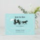 Boda de cuento de hadas salva las tarjetas de cita con una novia y un novio montando en un carro tirado por caballos. Marco ordenado sobre el fondo azul del huevo de un ladrón. ¡Perfecto para tu boda princesa de libro de cuentos! También disponible en otros colores. Póngase en contacto con pmcustomweddings@hotmail.com para ver los colores personalizados. Coincide con nuestro juego de bodas de cuentos de hadas y caballos.