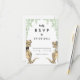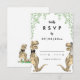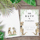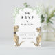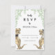 Tarjeta de respuesta de RSVP para boda divertida con tema de dinosaurios con novios dinosaurios graciosos rodeados de follaje botánico acuarelado para traer alegría prehistórica jurásica a tu día de boda. Tipografía caprichosa moderna con plantillas fáciles de personalizar. Novios T-Rex únicos en marrón y verde eucalipto acuarelado, arte original de la artista Catherine Sweetman. Ideal para la recepción de la boda o la cena de ensayo. La suite de boda a juego incluye todo lo que necesitarás en tu divertido viaje de boda.