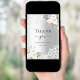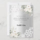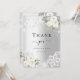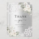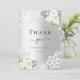 Una tarjeta de agradecimiento no fotográfica moderna y elegante. Un fondo falso plateado. Decorado con rosas blancas, flores y encaje blanco. Al frente del texto: Gracias de vuelta: Plantilla para Su nota de agradecimiento y nombres.