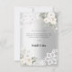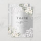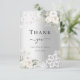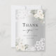 Una tarjeta de agradecimiento no fotográfica moderna y elegante. Un fondo falso plateado. Decorado con rosas blancas, flores y encaje. Al frente del texto: Gracias de vuelta: Plantilla para Su nota de agradecimiento y nombres.