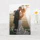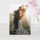 boda gracias tarjeta de fotos con elegante guión elegante de corazón blanco y un mensaje de agradecimiento a sus invitados. Personaliza la imagen y el texto de las parejas.