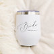 El tumbler de vino de boda personalizado para la novia presenta "novia" en tipografía elegante y clásica de caligrafía con sus iniciales y fecha boda debajo.