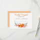 Este es un RSVP de boda floral brillante y colorido que coincide con invitaciones del mismo título en nuestra tienda. Cuenta con un ramo de flores de bonito con colores de naranja de mandarina, rojo, marrón y verde en la parte inferior. Encima de la imagen está tu texto personalizado en tangerina y marrón. La imagen y el texto se colocan en un fondo blanco. La parte posterior de la tarjeta es una mandarina suave y muda. Perfecto para eventos de verano o otoño.