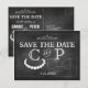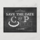 El diseño de Bowties y Pearls boda fue creado por Eggplant y Purple. Este moderno diseño incluye una hilera de perlas, una corbata de arco y una divertida tipografía blanca al estilo popular de la pizarra.