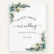Un color de fondo blanco. Decorado con vegetación eucaliptos y follaje dorado. Añade tus nombres y fecha de boda. Nuestro boda está escrito con una escritura de estilo moderno con letras a mano.