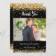 Una moderna tarjeta fotográfica de agradecimiento al boda. Un fondo negro decorado con un falso confeti dorado. Personaliza y agrega tu foto y nota de agradecimiento.