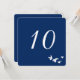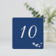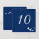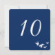 Diseño de tarjeta de número de mesa simple y elegante totalmente personalizable. La bandada de pájaros es blanca y tiene un fondo transparente para que puedas cambiar el color de impresión del papel para que coincida con el tema de tu evento. Todas las áreas de texto se pueden personalizar. El fondo azul predeterminado es ideal para bodas costeras o bodas judías.