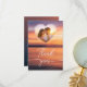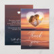 Esta tarjeta de agradecimiento incluye una cálida foto de la puesta de sol de Destei en tonos naranja y púrpura. El frente incluye una zona de fotos en forma de corazón para tu boda o foto de pareja favorita con un elegante texto de "Gracias" debajo. La parte trasera ofrece espacio para un mensaje personal, cerrando con "Con todo nuestro amor" seguido de sus nombres y un sutil detalle del corazón arriba. Una hermosa manera de expresar tu gratitud con un toque romántico e inspirado en la naturaleza.