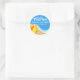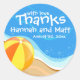 Un diseño cuidado muestra un balón de playa sentado en la arena con el agua azul más allá. El texto blanco se ve genial contra el agua azul del océano. Se lee con amor y gracias, los nombres de la pareja boda y luego su cita boda. Fácil de personalizar. Ideal para una boda en la playa, boda de verano, boda de destino.