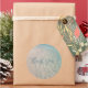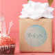 Boda en la playa gracias pegatinas. Agua en el fondo de la orilla, con la frase "gracias" en letra de escritura moderna. Los pegatinas redondos vienen en dos tamaños y pueden añadirse al dorso de los sobres o colocarse en un embalaje favorable.