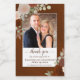 Estas etiquetas de vino en miniatura son perfectas para ser usadas como favores de boda o como una adición a una bolsa de swag para los miembros de su fiesta nupcial. El diseño presenta una foto rodeada de rosas acuáticos pintados a mano en tonos de naranja rojizo, madera quemada y melocotón de coral. La leyenda dice: Gracias por celebrar con nosotros, con los nombres de la pareja, la fecha del boda, y el tipo de vino u otro contenido de botellas. El diseño floral rústico acuático es perfecto para un boda de otoño o otoño.