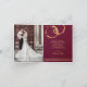 Boda Gracias tarjeta de notas con tu propia foto boda enmarcada por un diseño de temática vitivinícola con anillos de oro y oro rosa y chispas sobre un fondo burdeos y marsala. También hay espacio dentro para añadir más fotos.