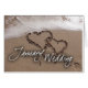 Dos corazones en la arena con las olas oceánicas y la boda de enero en la fuente blanca de la escritura. Perfeccione el diseño para anunciar su boda próximo de enero. ¡Ame en la playa!