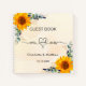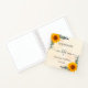 El pincel dorado acuarela como fondo. Decorado con girasoles, vegetación eucaliptus y follaje dorado. Añade tus nombres y fecha de boda. Sr. Mrs. y un corazón escrito con un estilo moderno con letras.