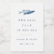 Nuestra diseño chic costero para bodas de verano, fiestas de compromiso o cenas de ensayo presenta un par de peces acuarela azules. "Dos menos peces en el mar" aparece en elegante letra azul marino. Personalice con dos líneas de texto personalizado; se muestra con sus nombres y fecha de boda.