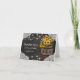 Elegantes tarjetas de agradecimiento con un fondo de pizarra negra rústica, decoración de encaje de novia en la esquina, luces de hadas, girasoles amarillos dorados de verano, un barril de madera de bodega con sus iniciales y un trozo de cuerda anudada.