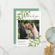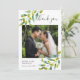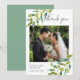 Tarjeta de agradecimiento de foto de boda en jardín de campo con delicado follaje verde acuarela, enmarcando su foto de boda con los detalles de agradecimiento en elegante letra gris pizarra.