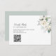 Una tarjeta boda RSVP de código QR con letras negras simples, follaje eucalipto y flores blancas.