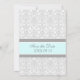 La boda permite guardar la tarjeta de invitación de fecha con un elegante damasco floral azul turquesa pastel, gris y blanco. Personalizable con los detalles de su boda, disponibles en una amplia gama de productos bodas a juego. Contáctenos para solicitar un cambio de color o un producto personalizado.