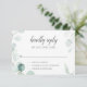 Invite a sus huéspedes a responder con elegancia y estilo con nuestra tarjeta RSVP Wedding de diseño. En el pináculo de esta elegante carta, la palabra "Amablemente" está inscrita artísticamente en un guión moderno, simbolizando la gentil naturaleza de su petición. Se combina de forma armoniosa con un delicado eucalipto de acuarela, con un toque de serenidad natural y una sofisticación sobria. El diseño refleja perfectamente la esencia de un boda refinado, inspirado en la naturaleza. Esta tarjeta RSVP no es más que una mera formalidad, es una expresión de buen gusto de la temática de tu boda, que combina a la perfección el encanto de la caligrafía moderna con la belleza tranquila del eucalipto, asegurando que tus huéspedes se sientan parte de tu día especial desde el mismo momento en que responden.