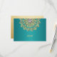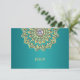 Tarjetas de respuesta de boda RSVP indias elegantes y modernas en azul teñido verde. El color de fondo se puede cambiar. Hermoso diseño de flor de Mandala en oro y diamante. La parte posterior tiene falso foil dorado. Plantillas editables: agregue su texto. Póngase en contacto con el diseñador para otras variaciones.