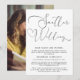 Debido a las pautas de distanciamiento social, es posible que deba reducirse el número de invitados en la boda. Haga saber a sus familiares y amigos sobre la actualización de la boda con estas elegantes y sencillas invitaciones de anuncio de ''boda más pequeña''. Los elementos de diseño incluyen una tipografía caligráfica de ''boda más pequeña'' sobre un fondo blanco, detalles en letras de moda y su foto en la parte trasera. Todo el texto es editable.