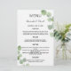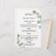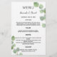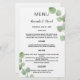 Personalice y agregue sus nombres, fecha y el menú boda. Fondo blanco, decorado con vegetación eucaliptos, brotes. Fondo blanco.