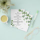 Tenga en cuenta que este menú está en papel de volante y es muy delgado. Los sobres no están incluidos. Para menús más gruesos (mismo diseño) visite nuestra tienda. Personalice y agregue sus nombres, fecha y el menú boda. Fondo blanco, decorado con vegetación eucaliptos, brotes.