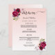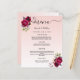 Carta boda elegante, moderna y romántica. dorado Rosa, fondo degradado de color rosa rubor, decorado con flores de color agua de color burdeos y oro rosa. Personalice y agregue sus nombres, fecha y el menú boda. Letras de color negro. La palabra Menu (Menú) se escribe con un guión a la moda con letras a mano con chispas. Parte posterior: fondo de gradiente dorado Subió.