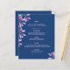 Carta boda florida, elegante y de moda. Personalice y agregue sus nombres, fecha y el menú boda. Fondo azul decorado con estribos botánicos y follaje rosa. Sus nombres están escritos con un guión moderno de estilo con letras a mano. Fondo azul.