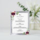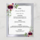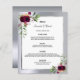 Una elegante carta de boda estilo bohemia. Las plumas y los rosas acuáticos exuberantes en burdeos. Plantillas para los nombres, fecha y menú boda. Marco falso plateado y blanco y moda, glamoroso color de fondo plateado plateado. Letras de color negro. Retroceso: fondo falso plateado metálico.