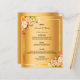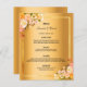 Una elegante carta de boda estilo bohemia. Rosas de color rosa dorado y acuático como decoración. Plantillas para los nombres, fecha y menú boda. Un marco de oro falso y un fondo metálico de oro falso. Letras de color gris oscuro. Retroceso: fondo de aspecto metálico de oro falso.