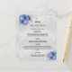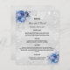 Un menú boda elegante y glamuroso. Personalice y agregue sus nombres, fecha y el menú boda. Fondo de aspecto falso plateado, decorado con un polvo falso purpurina y flores azules.