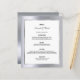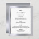 Un boda elegante y glamuroso o una carta de menú del 25 aniversario del boda. Plantillas para los nombres, fecha y menú boda. Marco falso plateado y blanco y moda, glamoroso color de fondo plateado plateado. Letras de color negro. Retroceso: fondo falso plateado metálico.