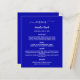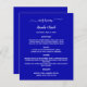 Un menú boda clásico. Un fondo azul real. Texto blanco. Personalice y agregue su nombre, fecha y menú. Puede añadir más texto, fotos en la parte posterior. 1 hoja = 1 borde impreso del menú a borde.