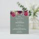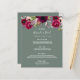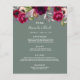 Una elegante carta de boda estilo bohemia. Lujosos rosas acuáticos, de color rosa y burdeos. Plantillas para los nombres, fecha y menú boda. Fondo verde sabio delante y detrás. Letras de color blanco.