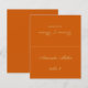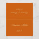 Una simple tarjeta de boda de naranja quemada con el nombre del invitado y el número de la mesa impreso en la parte delantera y los nombres de novios y novios y la fecha del boda impresa en el otro lado (es la otra mitad, antes de doblarla). Todo el texto es un guión caligráfico amarillo dorado. Tamaño: 4,5" x 5,6" antes del plegado, es decir, 4,5" x 2,8" después del plegado.