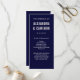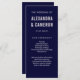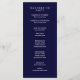 Este moderno programa de bodas presenta un texto rosado con fondo azul marino.