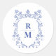 Sello elegante con un escudo floral azul. Fácil de editar con sus iniciales.
