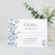 Una tarjeta RSVP elegante y sencilla para un boda con plantillas para responder por fecha y nombre. Un fondo blanco de moda en la parte delantera. Decorado con estribos botánicos y follaje de color agua. El título Kindly Reply está escrito con un gran guión moderno de estilo manuscrito. Fondo azul turbio, letras grises oscuras.