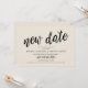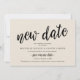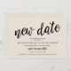Esta es una tarjeta de anuncio de boda pospuesta, con título de tarjeta, nueva fecha, en letra script negra, diseño rústico moderno con tema crema.