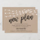 Esta es una tarjeta de anuncio de boda pospuesta, con título de tarjeta, nuevo plan, en letra script negra, granja rústica kraft moderna, luces de cuerda, diseño temático.