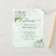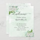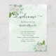 Fondo verde acuático, decorado con flores blancas, vegetación eucaliptos y polvo falso purpurina plateado. Personalice y agregue sus nombres y la cronología del día de la boda.