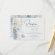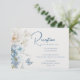 Las románticas tarjetas de Boda de recepción de la recepción con flores azules de color azul turquesa presentan celeste azul polvoriento y flores delfinísimas con vegetación eucalipto acentuada con mariposas. Añade el texto personalizado en un guión moderno y elegante. Perfecto para boho, jardín, boda vintage y rústico. Diseñado por Evco Studio www.zazzle.com/store/evcostudio