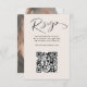 Esta moderna tarjeta RSVP combina elegancia y comodidad con tipografía limpia y contemporánea sobre un suave fondo beige. Una sección dedicada de código QR permite a los clientes acceder rápidamente a la información de su sitio web boda o RSVP, lo que simplifica el proceso de respuesta. El reverso ofrece un toque personal con espacio para la foto y el monograma, añadiendo un detalle único e inolvidable. Completamente personalizable, este diseño elegante combina el minimalismo con la sofisticación, asegurando que se complemente con cualquier estilo boda, al tiempo que le ayuda a reunir respuestas con facilidad y estilo.